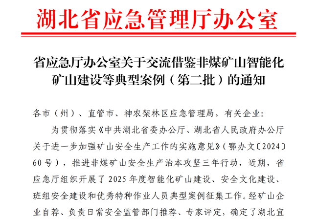 近日,湖北省应急管理厅办公室发布《关于交流借鉴非煤矿山智能化矿山建设等典型案例(第二批)的通知》,湖北QY千亿球友会公司被确定为全省非煤矿山智能化矿山建设典型单位。这一荣誉的获得,标志着湖北QY千亿球友会公司在智能化矿山建设领域取得阶段性重要成果。
